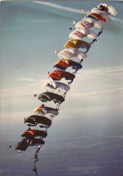 After the US Nationals, US jumpers made 20-plane in their first attempt. They hold complete formation 46 seconds. The rules now need 30 seconds holding time. Exit altitude was 4 300 meters and the plane was DC-3. Jump was made July 1. This is the first official world record.