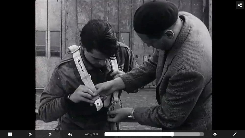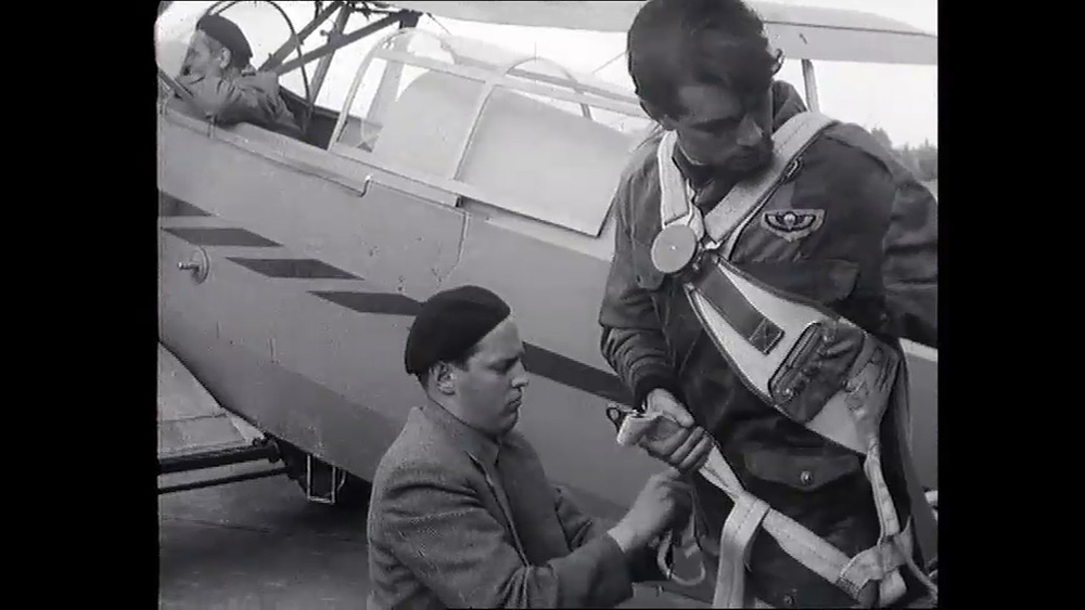 Angus Cherrington, laskuvarjojääkäri Isosta-Britaniasta hyppäsi Malmilla Irvin laskuvarjolla kesällä 1954.